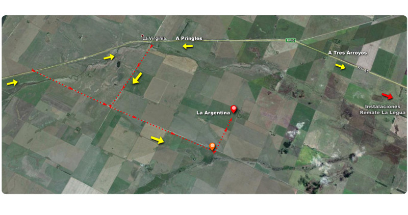 -Viniendo por la ruta 85 desde Tres Arroyos ,a unos 80 kms desde el cruce de ruta 3 ,y 5 kilómetros pasando la Feria de Remate de La Legua ,en el paraje La Virginia (Escuela ,Destacamento Policial) se baja a mano izquierda ,hay un vado de arroyo ,cartel celeste .SON 3 kms y se dobla a la izquierda en el cruce ,hay otro cartel celeste allí .De ahí son 4 kms . La entrada es a mano izquierda ,tranqueras y cartel blancos .